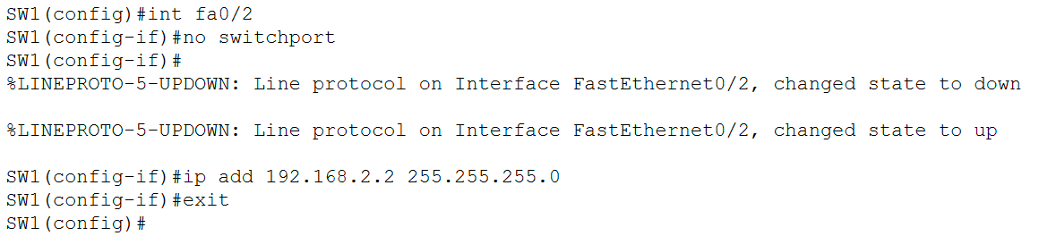 - 输入 int fa0/2 -> no switchport -> ip add 192.168.2.2 255.255.255.0 -> exit