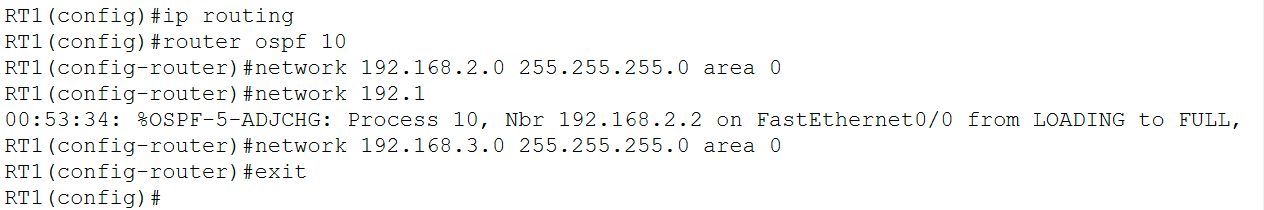 - 进入CLI中,输入 ip routing -> router ospf 10 -> network 192.168.2.0 255.255.255.0 area 0 -> 192.168.3.0 255.255.255.0 area 0 -> exit