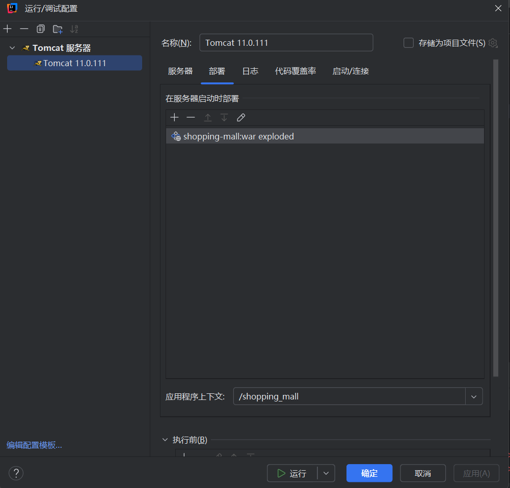 在 “应用上下文” 输入框中,填写项目的访问路径(如/shopping-mall,最终访问地址为http://localhost:8080/shopping-mall)。