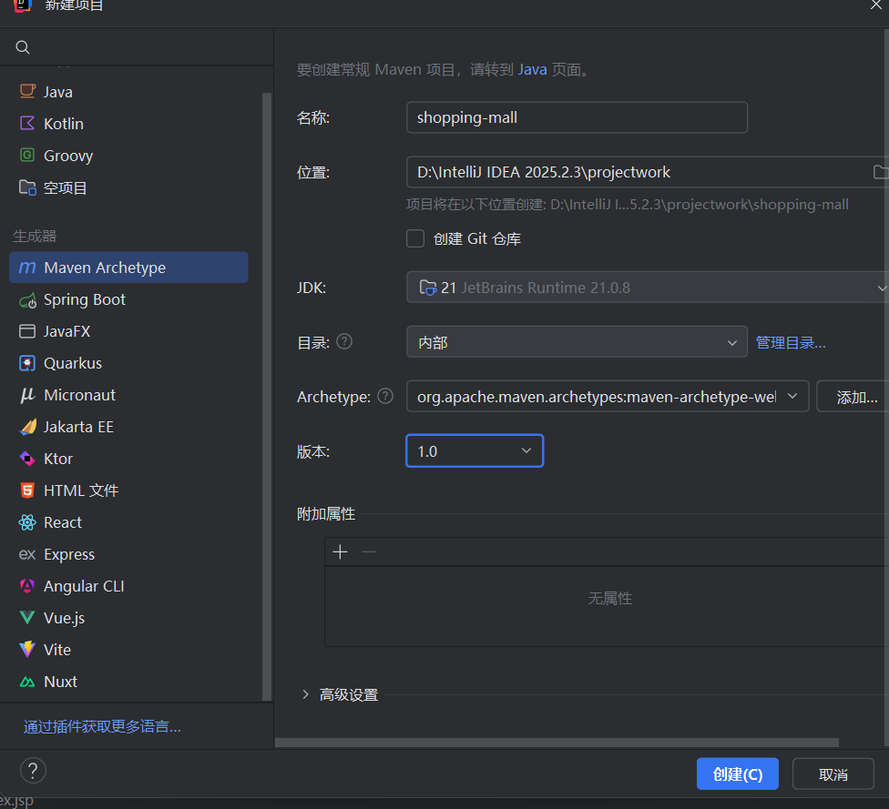untitled改为自定义项目名(如shopping-mall,需小写、无特殊字符)。 - 位置:可保持默认路径或点击文件夹图标选择自定义存储路径。