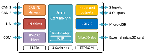 16 KbitEEPROM:存放配置参数、VIN号、校准数据等。MicroSD卡槽:用于海量数据记录、存储DBC/LDF文件、或作为固件更新介质。