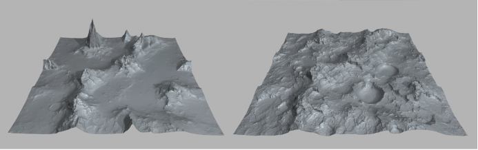 在这里,您可以在 Blender 中看到 2 个应用了置换贴图的网格,我喜欢在 Blender 中使用简单的细分和置换修改器预览内容。后来我将它们带入 Octane 并复制/移动它们以创建完整的景观。将您使用的唯一资产数量限制为 2-3 有助于保持所有内容的统一;您只需缩放/翻转/移动事物即可获得大量变化。