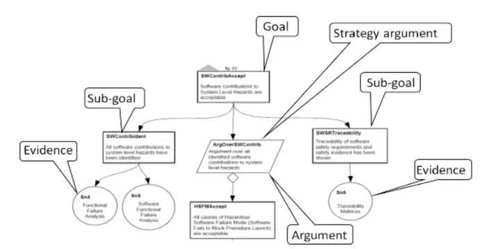 我们可以对图形符号形式进行扩展,增加指向相关信息的链接 —— 例如,在顶层主张(如图 1 中的 “SWContribAccept” 框)中添加指向危险场景描述的链接。