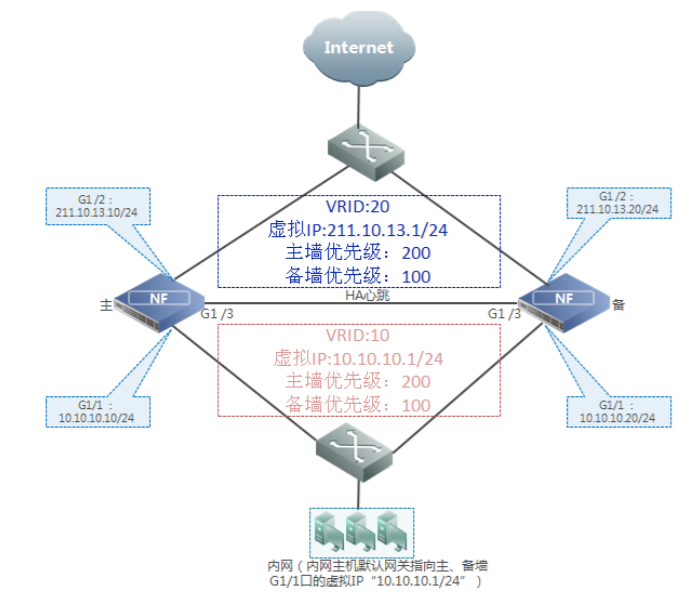 #这里数据报文从主墙 NF的G1/2 接口转发,下一跳地址和G1/2 实际使用的虚拟IP地址应该在同一网段。