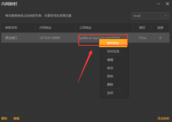 5,创建好后,就可以看到一条映射的公网地址,鼠标右键点击【复制地址】。