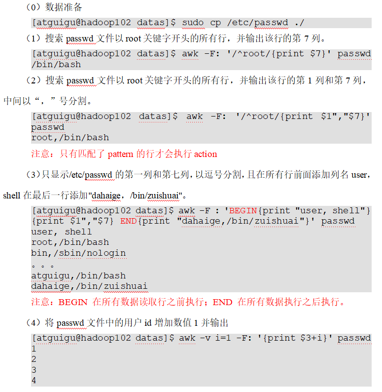 [atguigu@hadoop102 datas]$ cat chengji.txt | awk -F " " '{sum+=$2} END{print sum}'