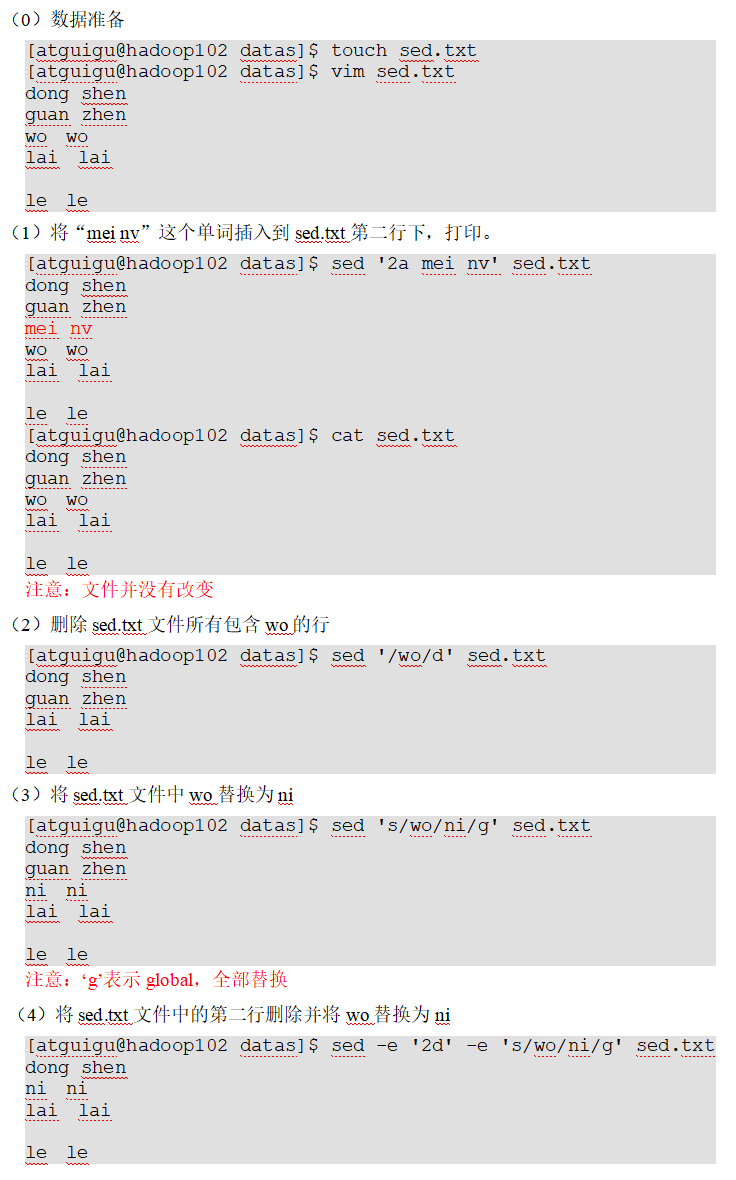 sed是一种流编辑器,它一次处理一行内容。处理时,把当前处理的行存储在临时缓冲区中,称为“模式空间”,接着用sed命令处理缓冲区中的内容,处理完成后,把缓冲区的内容送往屏幕。接着处理下一行,这样不断重复,直到文件末尾。文件内容并没有改变,除非你使用重定向存储输出。