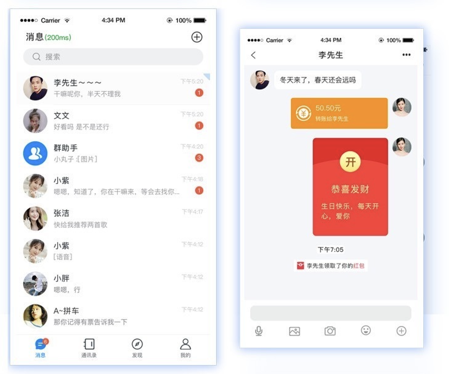 多元素聊天:文字,语音,图片,小视频,GIF动态图,消息通知,@提示,@全体成员。