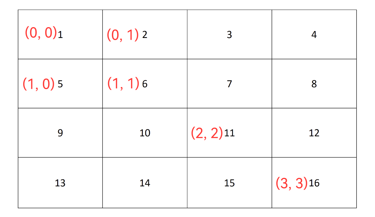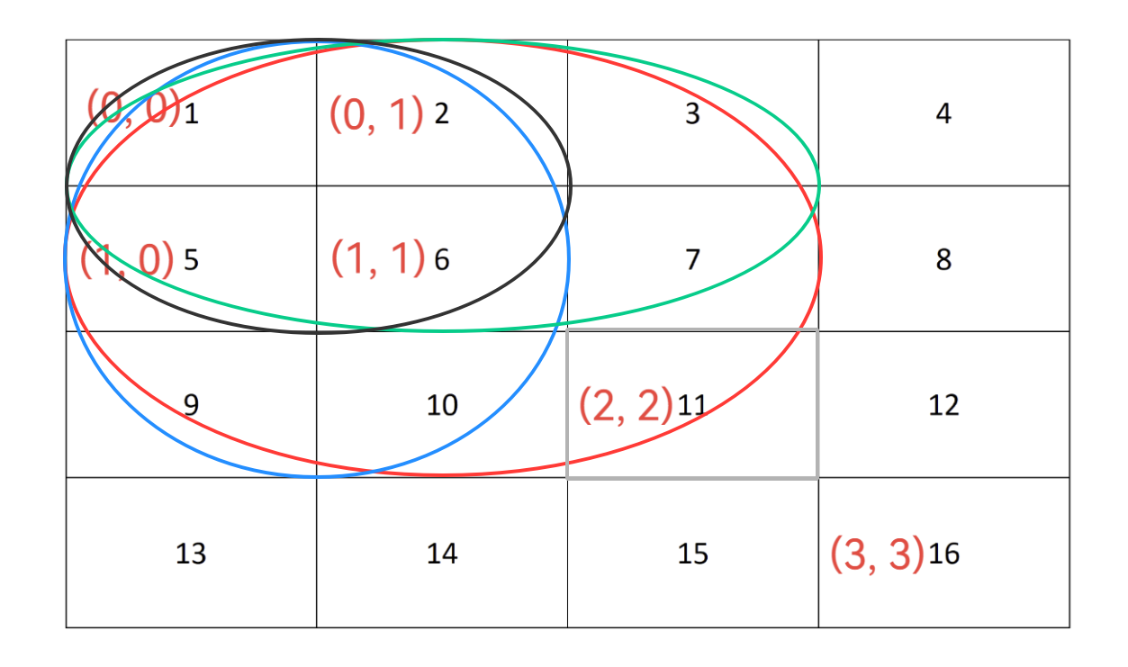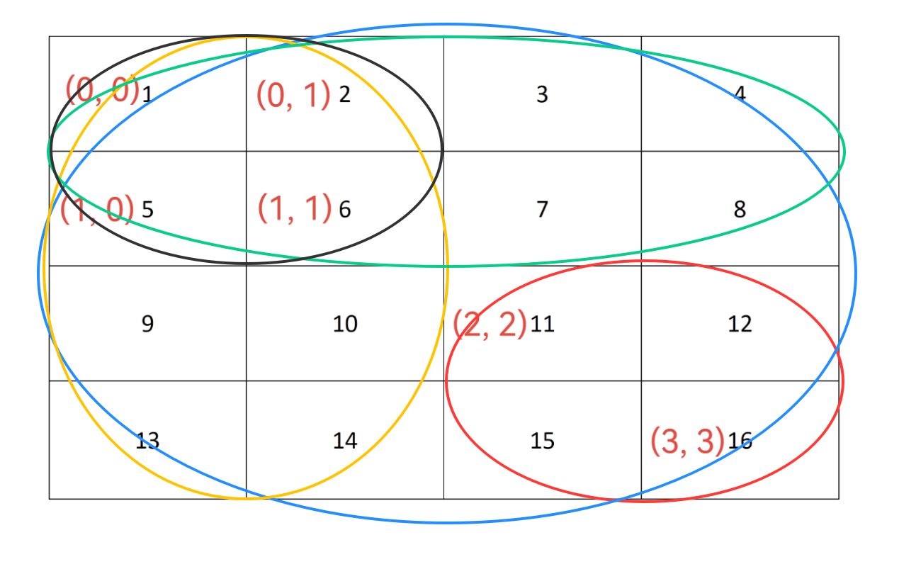 有这么一个二维数组,其中标注了一些元素的坐标,其余元素依此类推,所以说如果是 (0, 0) - (1. 1),那么表示的就是 (0, 0)、(0, 1)、(1, 0)、(1, 1) 这四个位置元素的和。