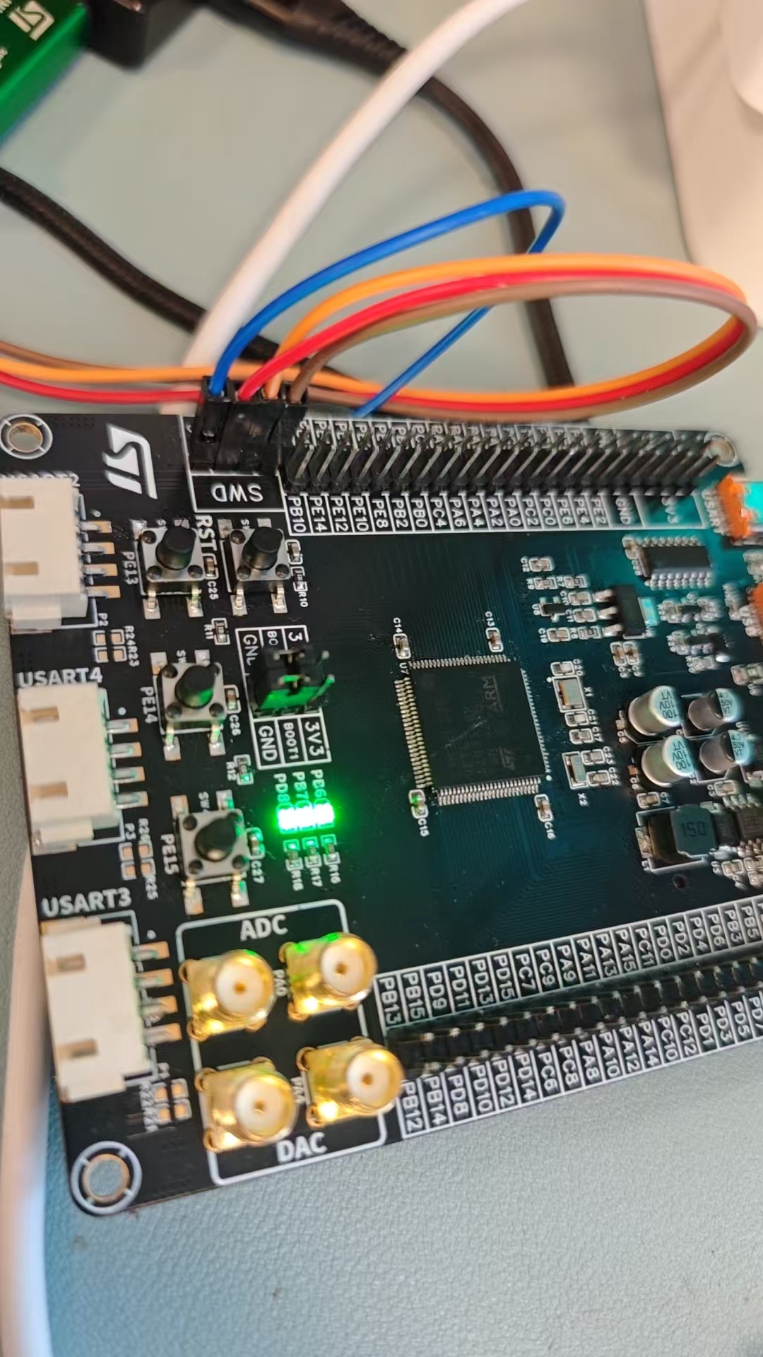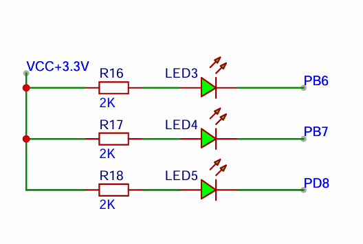 三个LED均为上拉状态,GPIO输出低电平点亮,高电平熄灭。