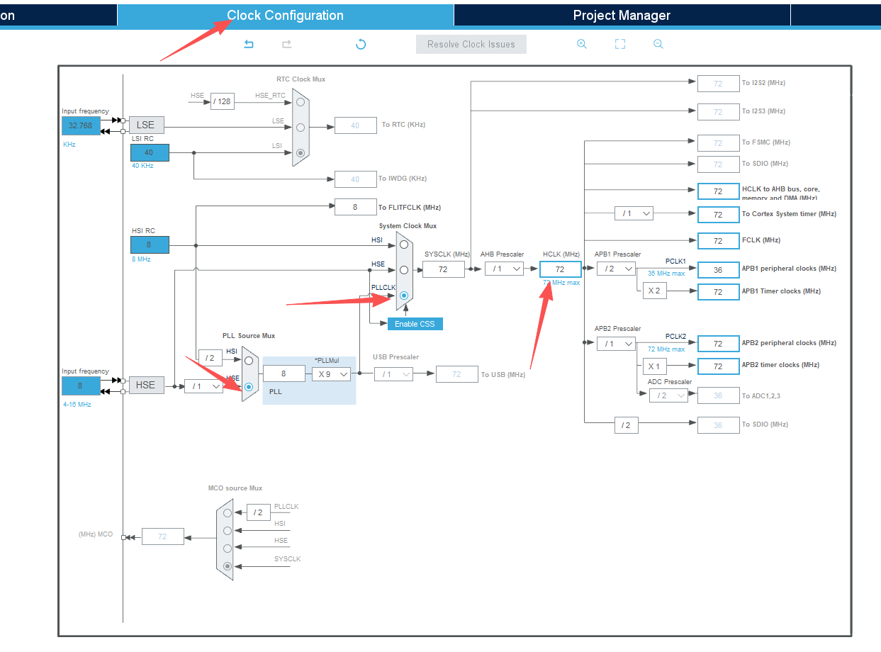 注意开发板上的晶振频率,通过倍频配置为72Mhz