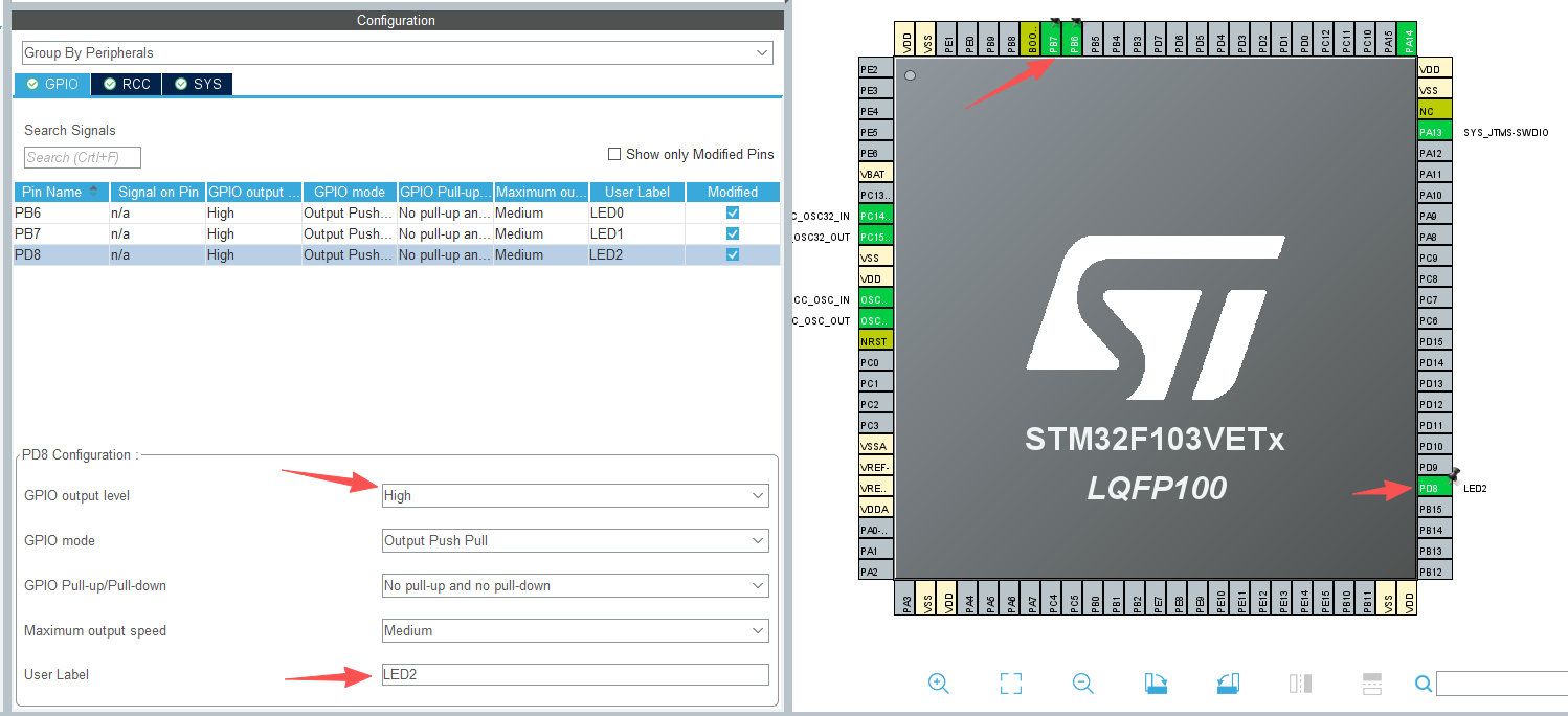 根据原理图配置输出模式,初始状态设为高电平,保持熄灭状态。