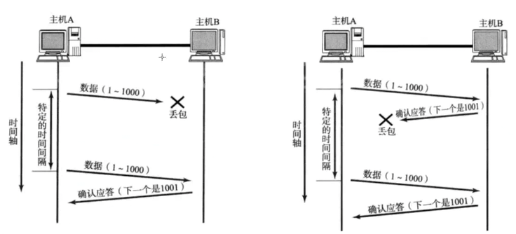 丢包的情况就两种:1.主机A给B发消息,发的消息丢了;2.主机B给A发送应答,应答丢了。