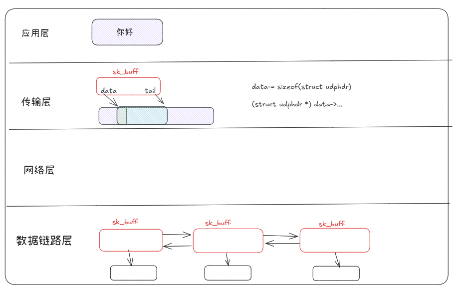 data指针代表一个报文的开始,tail代表报文的结束,而报文=报头+有效载荷。每经过一层网络协议栈,添加报头就是让data指针移动对应协议头大小的空间。所谓的封装和解包,本质就是在移动data指针在缓冲区中的位置。