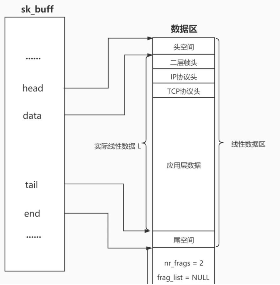 内核对于一个报文的组织,实际上是sk_buff+内存空间的内容!那么是如何关联到内存空间的?由sk_buff中的指针完成。
