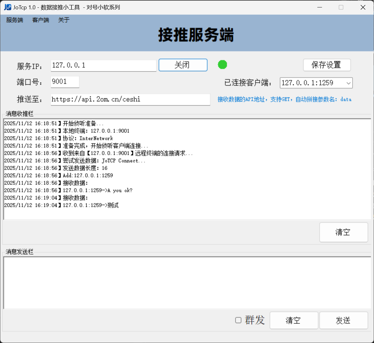 JoTcp: 一套用于通过TCP/IP协议获取数据,并通过API接口推送数据的小工具,非常适用于各种物联网设备联调、服务端数据采集转发使用。基于C#编写,免费给所有人合法使用。