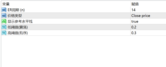 ER指标对于我来说,只是作为当前市场价格变化的效率,是否在磨还是在毫不犹豫的走。这个指标是不能直接作为开仓的信号的,因为你不知道是否就在顶部或者底部进入,但是我的指标参数是有标注的指示线,一般而言,如果ER值超过0.3或0.4,我用14条K做为周期,可以视为市场价格运动效率的提高,但这还需要更多的其他信号来辅助。有兴趣的朋友可以在评论区留言,大家一起探讨如何使用。下图是这个指标的参数: