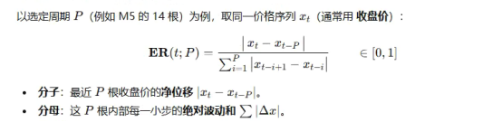 价格变化效率这个概念首先我们先要理清,如果价格由1元升到2元,中间经历的K线是10条,我们用这个作为基准,如果同样是1元升到2元,中间只需要2条K线,这就是效率高的情况,如果1元升到2元,中间需要经历20条K线,那就是效率低的表现,这就是对于价格变化效率的初始化定义。在这个定义的基础上,我们可以进行量化计算,并编写出指标,这个指标称为ER(Efficiency Ratio)效率比指标。