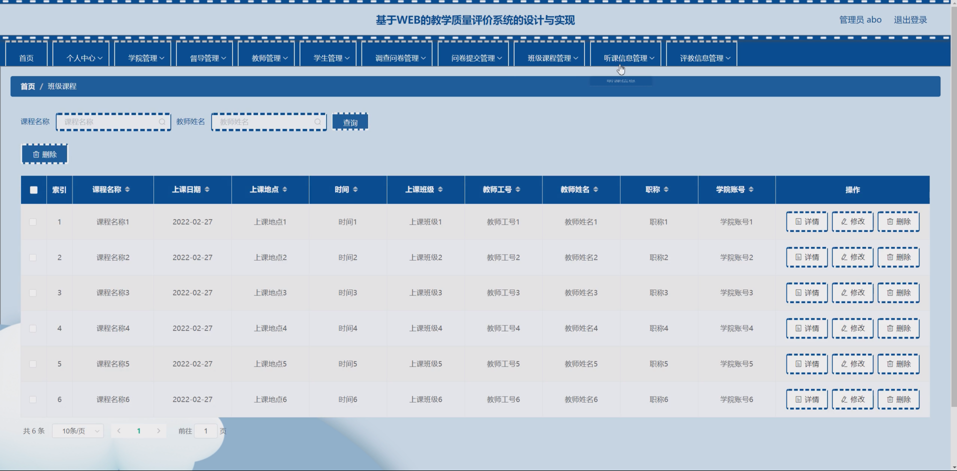 系统项目功能有:学院,督导,教师,学生,调查问卷,问卷提交,班级课程,听课信息,评教信息