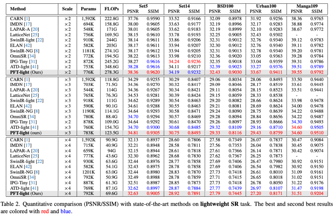 构建了PFT和PFT-light两种模型,分别适用于标准与轻量级超分辨率任务,在多个基准测试中取得最优性能。