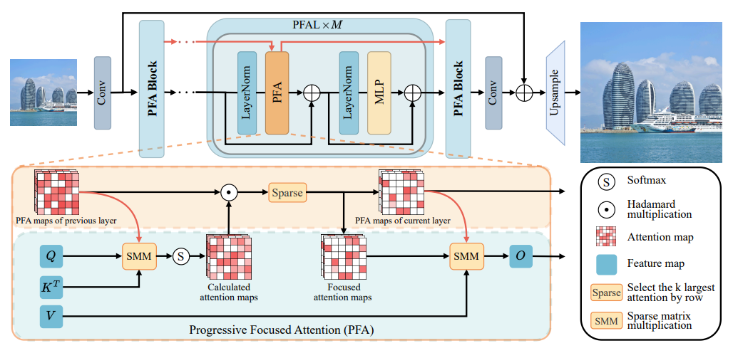 为解决这一问题,本文提出了一种渐进聚焦Transformer(Progressive Focused Transformer, PFT),通过渐进聚焦注意力(Progressive Focused Attention, PFA) 机制,将网络中原本孤立的注意力图连接起来,逐步聚焦于最重要的图像块(token),从而在提升重建质量的同时显著降低计算开销。