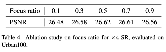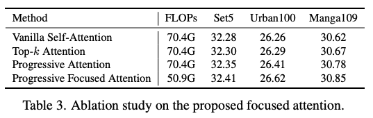 【表3】验证了PFA相比传统自注意力和Top-注意力的优势,PSNR在Urban100上提升0.36dB,计算量降低27.69%。