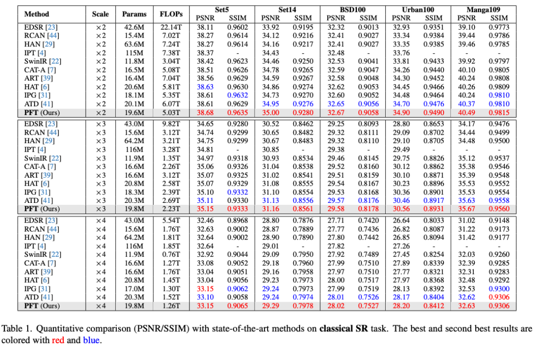 【表1】展示了PFT在多个数据集上 、、 超分辨率任务中的PSNR/SSIM结果。PFT在多数情况下优于HAT、ATD等方法,且计算量(FLOPs)更低。