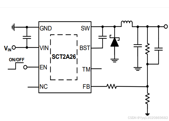 SCT2A26采用具有集成环路补偿的恒定导通时间(COT)模式控制,大大简化了转换器的外围配置。