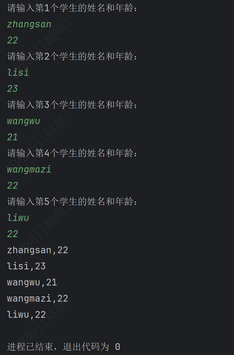 代码如下:主要注意两个点,一个是创建学生对象要放在for循环里边,不然只会创建一个地址,后续会对同一个地址值里的内容进行覆盖