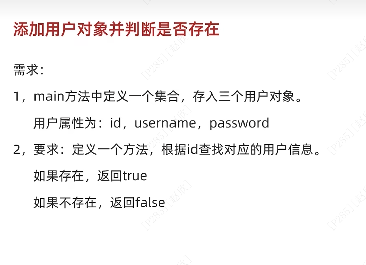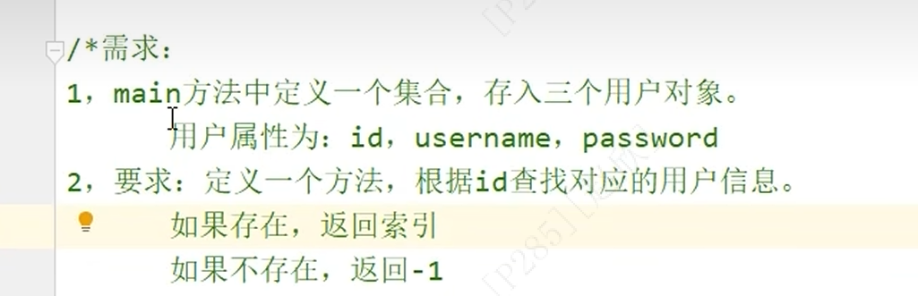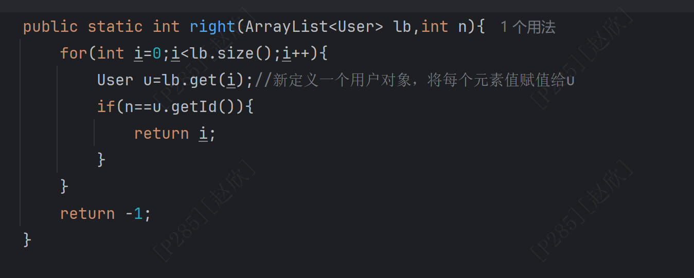 ArrayList<User> list = new ArrayList<>();//因为是用户对象,所以前面的括号中是类的名称!User u1=new User(1,"zhangsan","123456");User u2=new User(2,"lisi","asdfgh");User u3=new User(3,"wangwu","123asd");list.add(u1);list.add(u2);list.add(u3);boolean flag=right(list,4);//定义一个方法判断是否存在id号一致的对象System.out.println(flag);}public static boolean right(ArrayList<User> lb,int n){for(int i=0;i<lb.size();i++){User u=lb.get(i);//新定义一个用户对象,将每个元素值赋值给uif(n==u.getId()){return true;}}return false;}