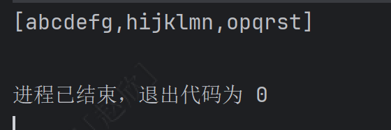 package com.xzhao.test.cat;import java.util.ArrayList;public class Together {public static void main(String[] args) {ArrayList<String> list = new ArrayList<>();list.add("abcdefg");list.add("hijklmn");list.add("opqrst");System.out.print('[');for (int i = 0; i < list.size(); i++) {if(i!=list.size()-1){System.out.print(list.get(i)+",");}else{System.out.print(list.get(i));}}System.out.println("]");}}结果如下: