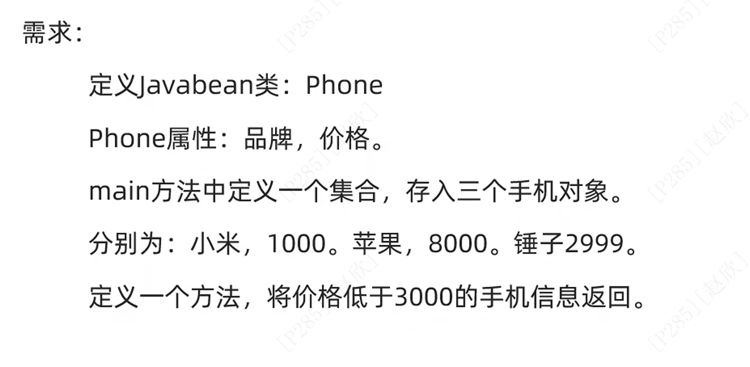 }public static ArrayList<Pho> information(ArrayList<Pho> li){ArrayList<Pho> Phone=new ArrayList<>();//返回的值不止一个值,可以放到集合中返回for(int i=0;i<li.size();i++){Pho p=li.get(i);if(p.getPrice()<3000){Phone.add(li.get(i));}}return Phone;
