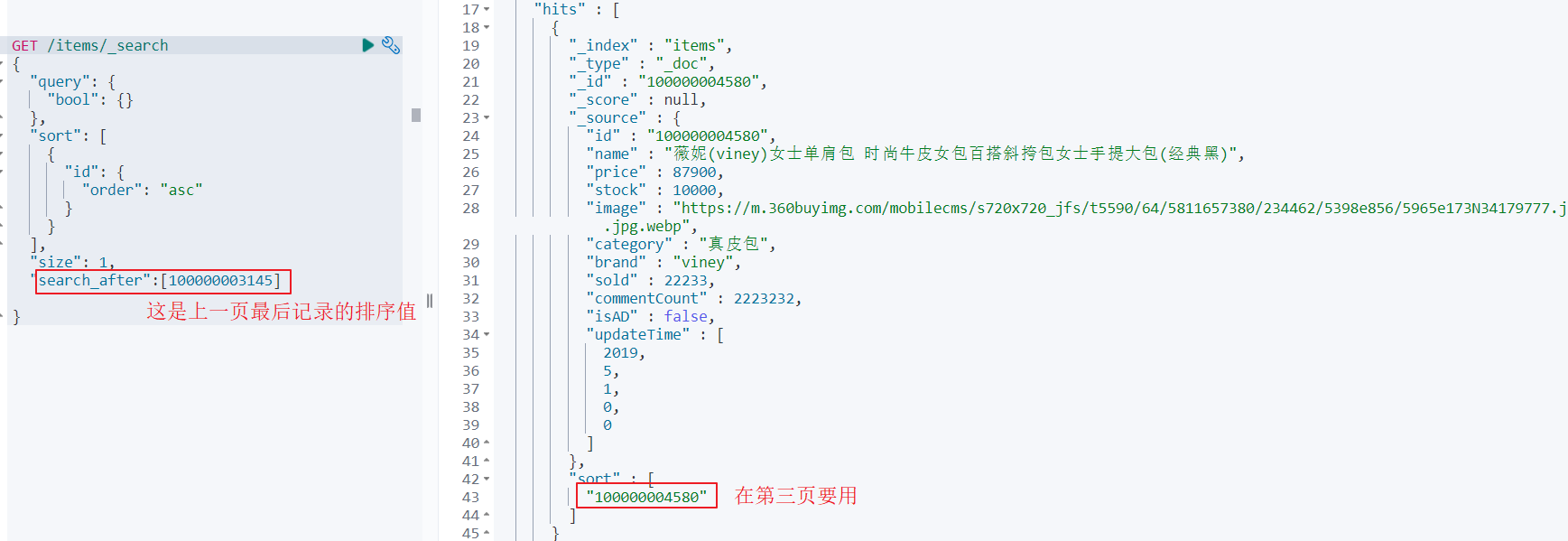 void testSearchAfter() throws IOException {// 1.创建RequestSearchRequest.Builder builder = new SearchRequest.Builder();builder.index("items");builder.query(q -> q.bool(b -> b)).sort(s1 -> s1.field(f -> f.field("id").order(SortOrder.Asc))).searchAfter("0").size(1);SearchRequest request = builder.build();SearchResponse<ItemDoc> response = esClient.search(request, ItemDoc.class);// 解析响应handleResponse(response);}