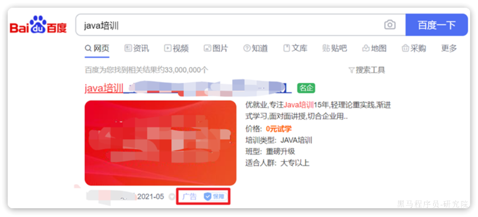 例如在百度中搜索Java培训,排名靠前的就是广告推广: