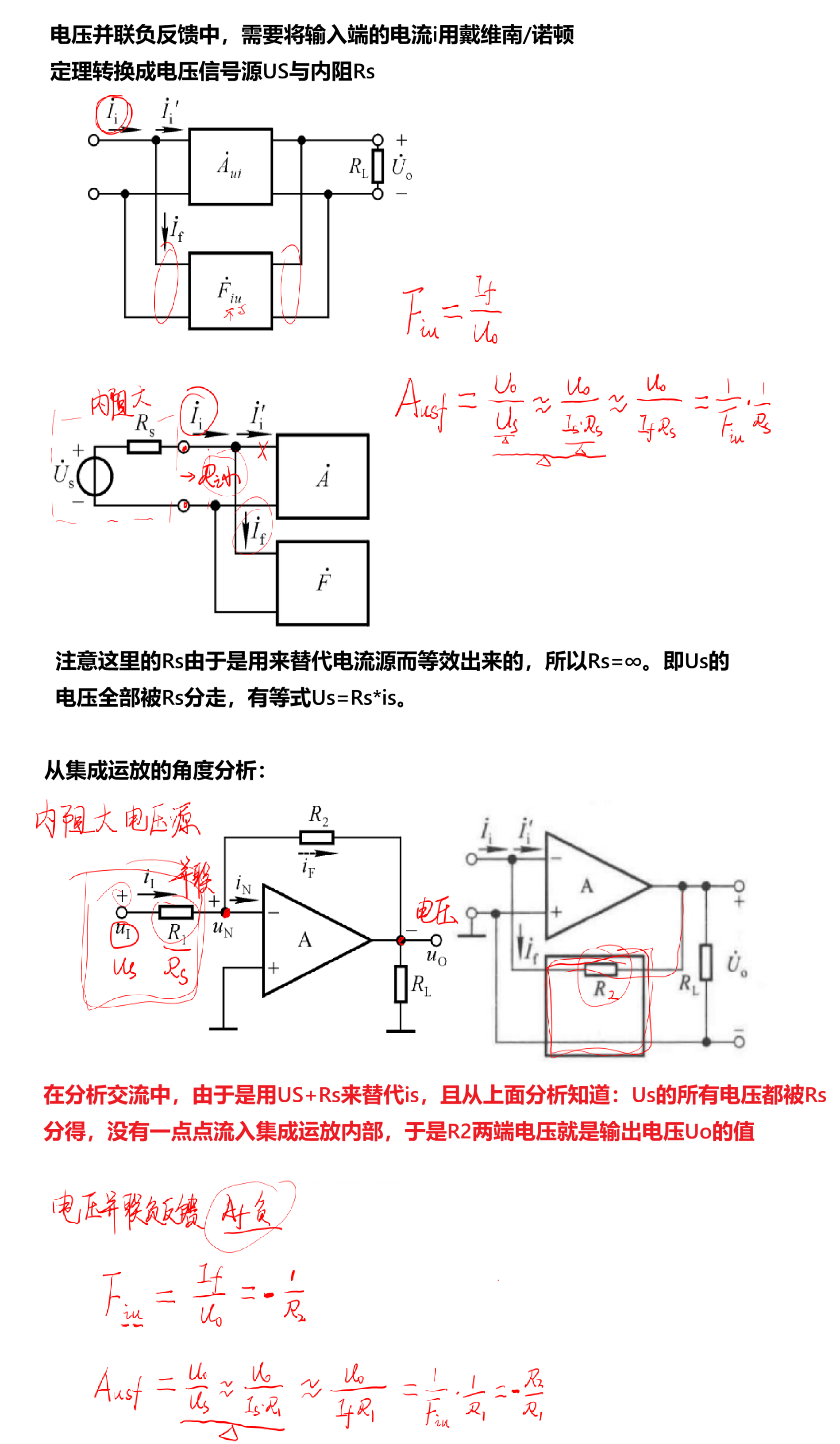 (2)由于集成运放的开环增益A无穷大,总的增益可以化简成1/F。且A越接近无穷大,这个约等号越成立,我们称为深度负反馈。