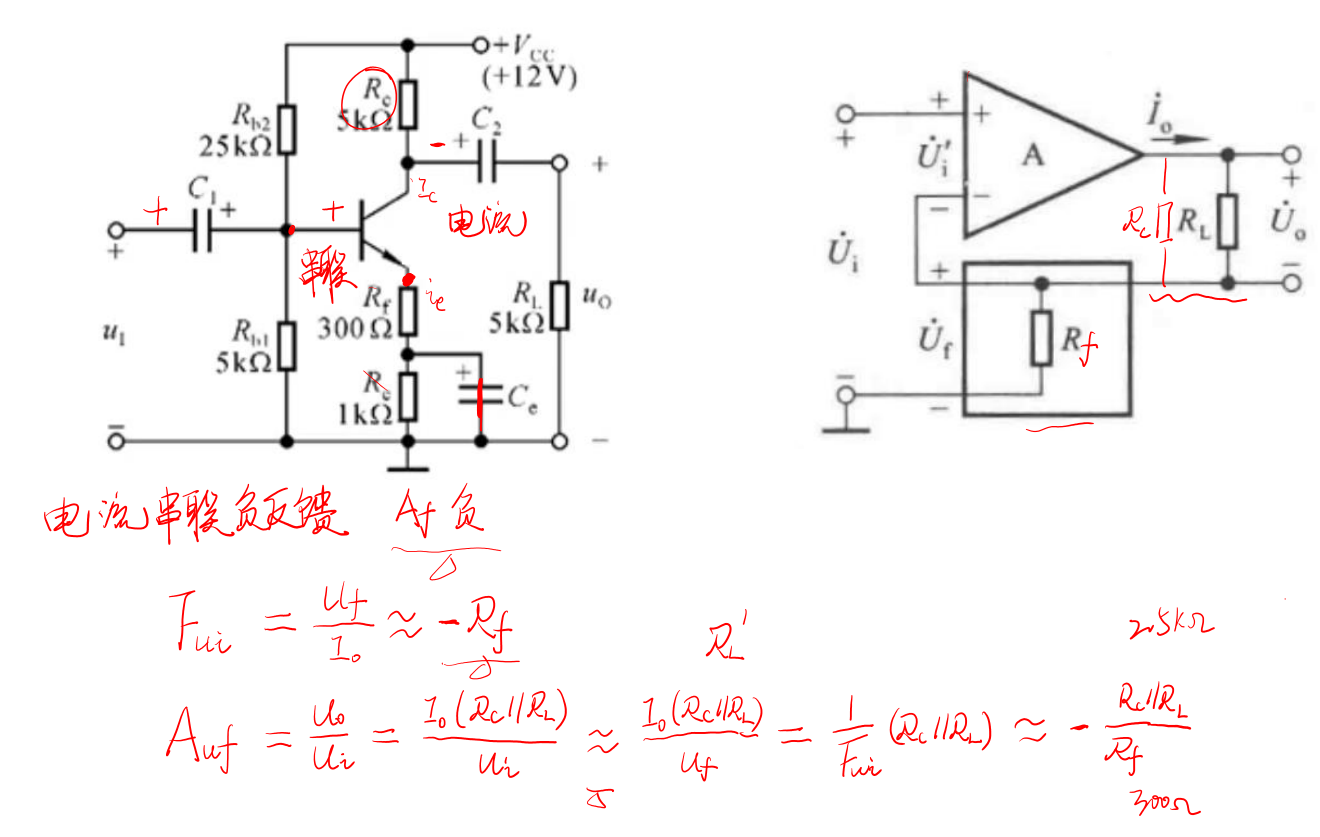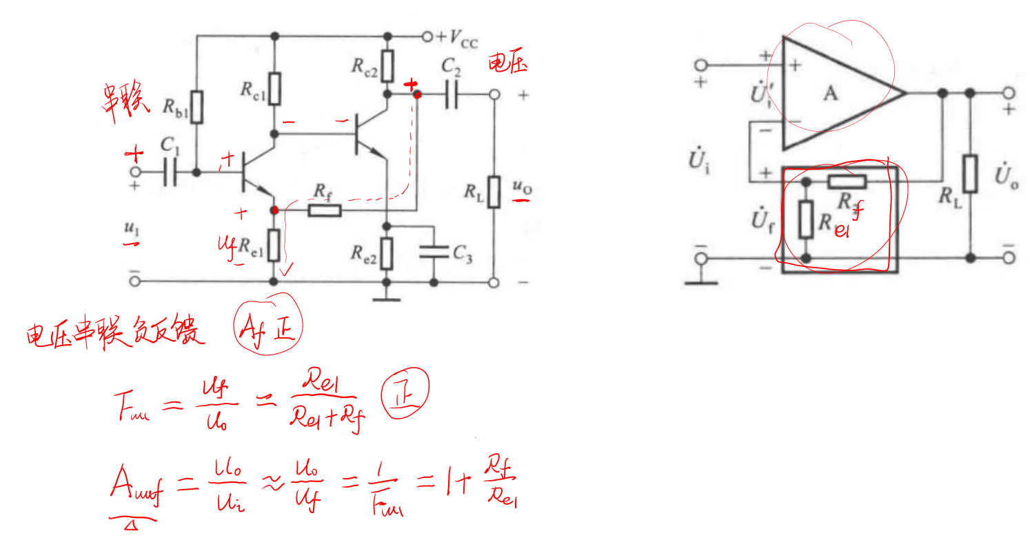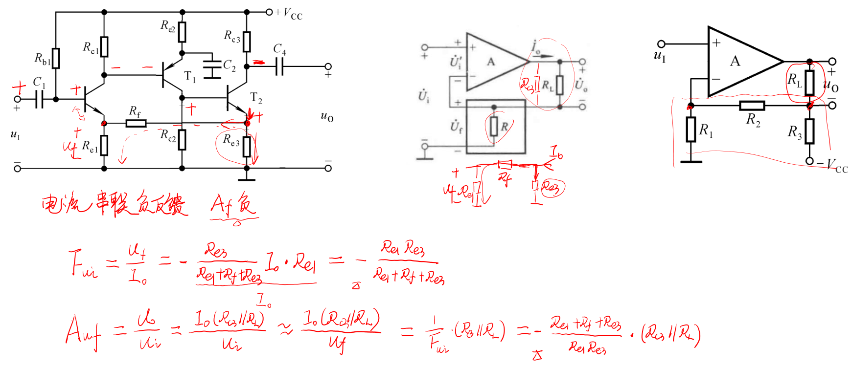 对于深度负反馈情况下,要我们求解总的放大倍数Auf。我们需要先分析出他是4种组态中的哪一种,然后根据下标写出F的下标以及表达式。最后用Uo/Ui,并带入F计算出结果。