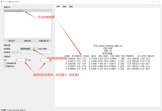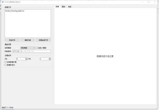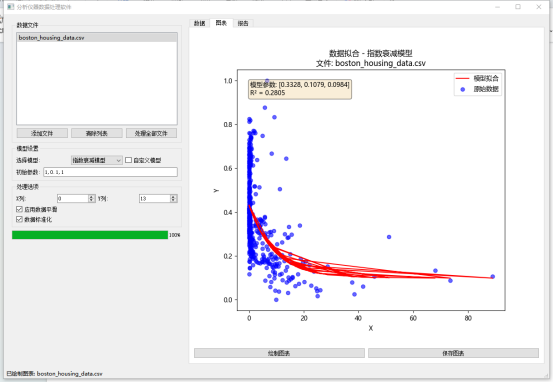 (3)加载数据显示,选择模型下拉列表里选择指定模型,提供多种理论模型(线性、指数、对数、多项式、高斯)支持自定义模型函数,可设置初始参数值数据平滑和标准化选项。在处理选项中选择因变量和自变量。