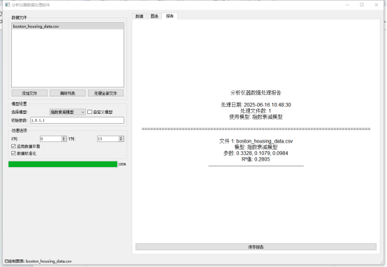 (5)报告生成:自动生成处理报告包含处理日期、文件信息、模型参数和拟合结果