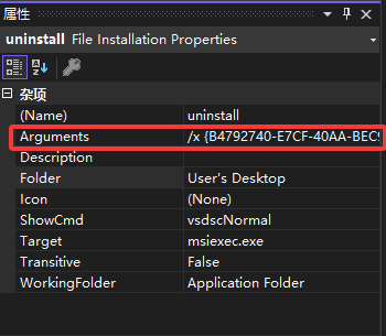 找到刚刚创建的uninstall快捷方式,右键查看属性,在属性页面中修改Arguments为 /x ProductCode