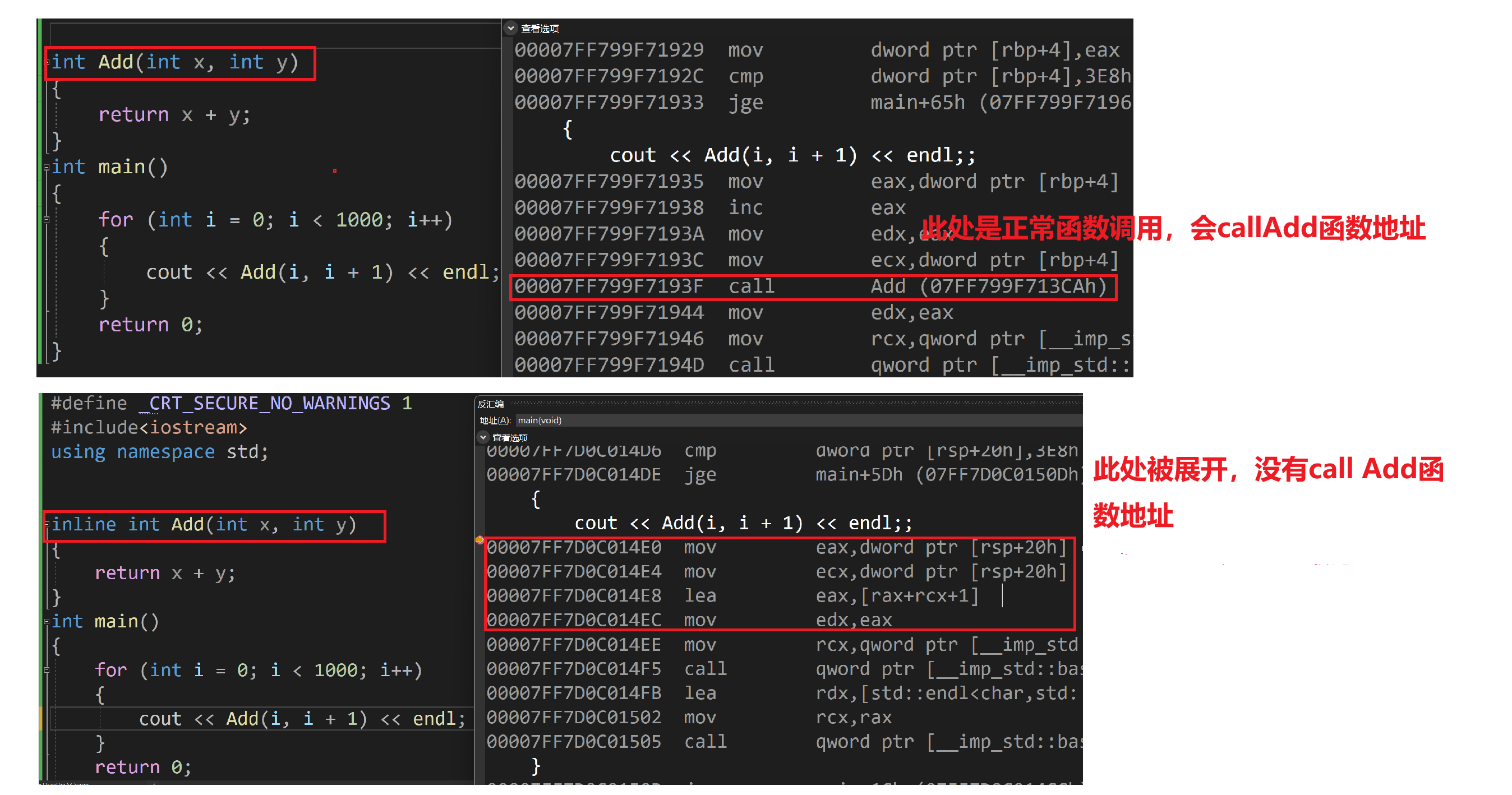 默认debug模式下,inline不会起作用,会call Add函数地址。可以在release模式下,查看编译器生成的汇编代码是否存在call Add函数地址。