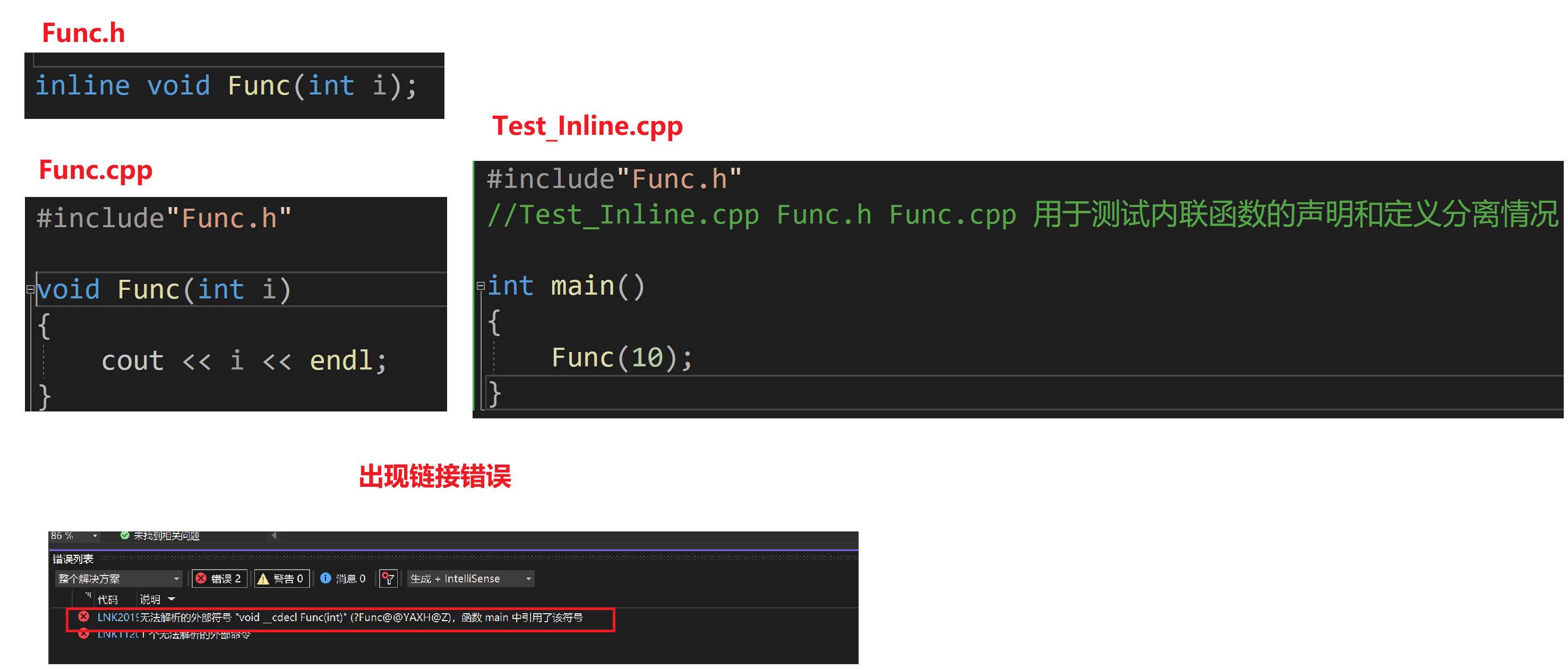 4.2、内联函数声明与定义不分离,因为预处理Test_Inline.cpp头文件展开,得到内联函数inline void Func(int i) 的声明,编译阶段可以通过,但是在链接阶段,由于inline函数已经展开没有地址,不会进符号表,链接不上地址,在链接阶段会报错。