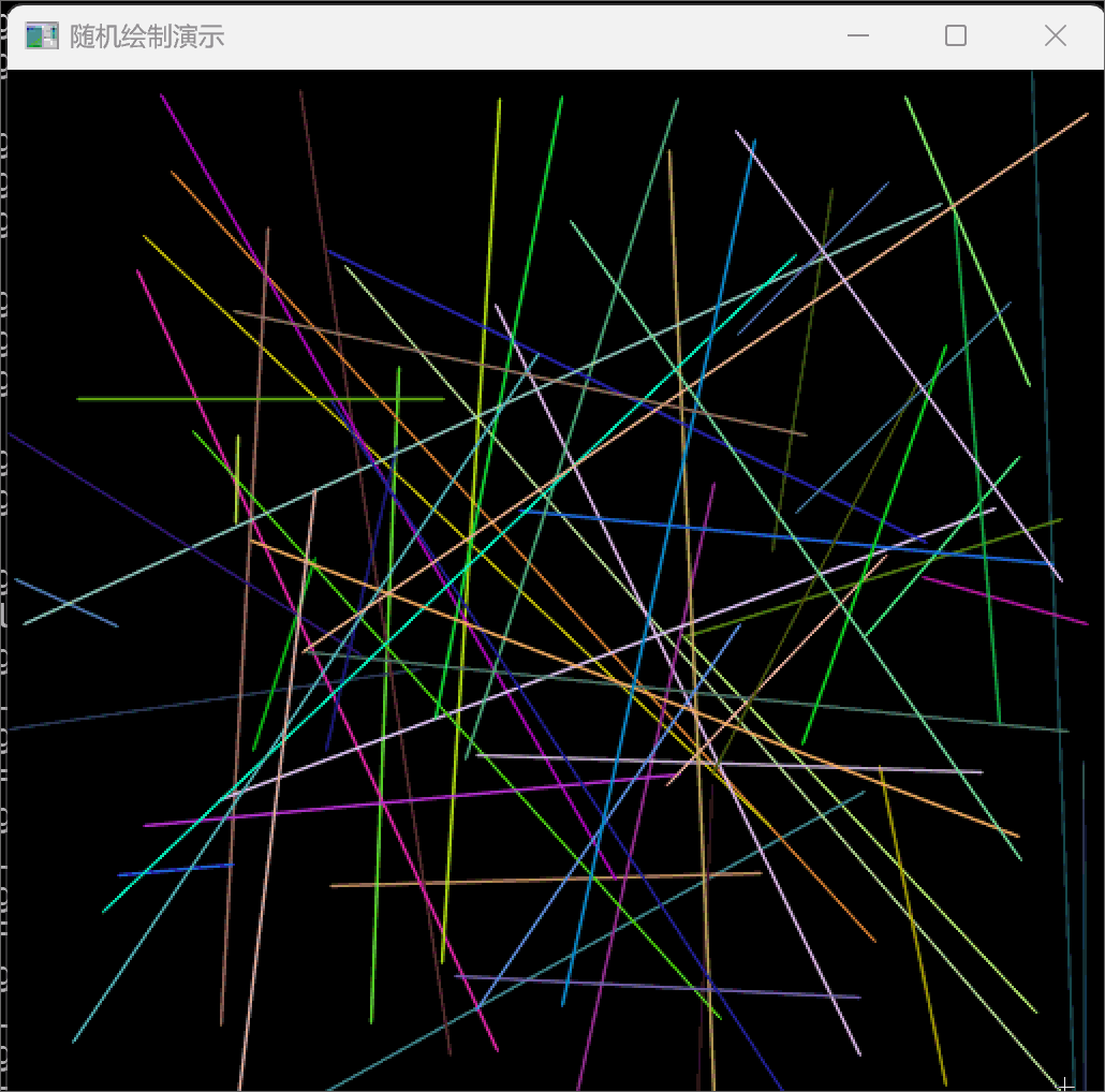 using namespace std;void random_drawing() {// 创建一个 512x512 的黑色图像Mat canvas = Mat::zeros(Size(512, 512), CV_8UC3); int w = canvas.cols; // 图像的宽度int h = canvas.rows; // 图像的高度// 创建 RNG 对象,用于生成随机数。12345 是种子值,确保每次生成相同的随机数RNG rng(12345);while (true) {// 等待用户输入,按 100 毫秒检查一次int c = waitKey(100);if (c == 27) { // 按下 Esc 键退出循环break;}// 随机生成四个点,表示线条的