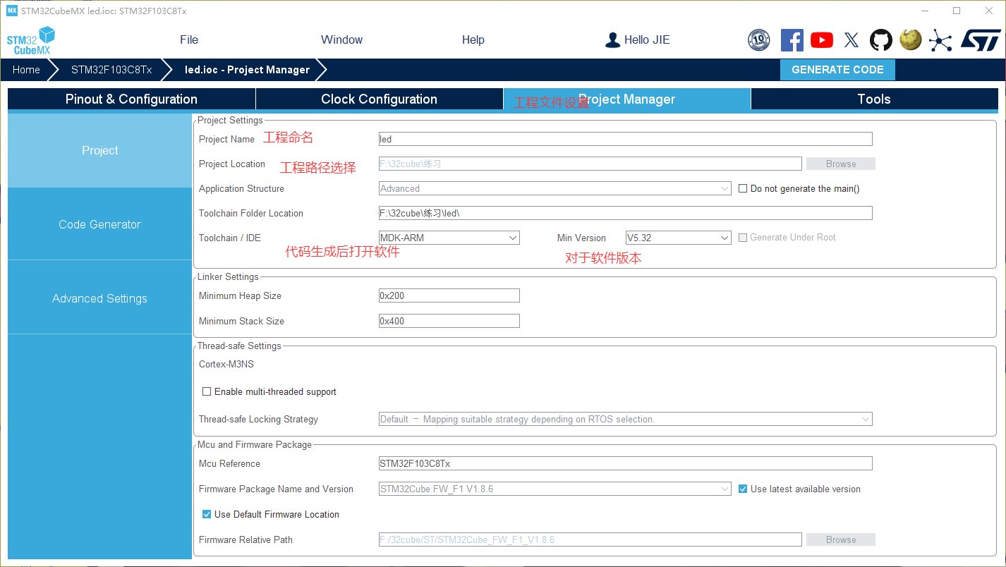 然后点击code Generator,看个人配置生成必要的文件以及.c和.h文件,然后点击右上角generate code,在对应keil中打开文件,看功能然后在main文件中编写对应部分即可。