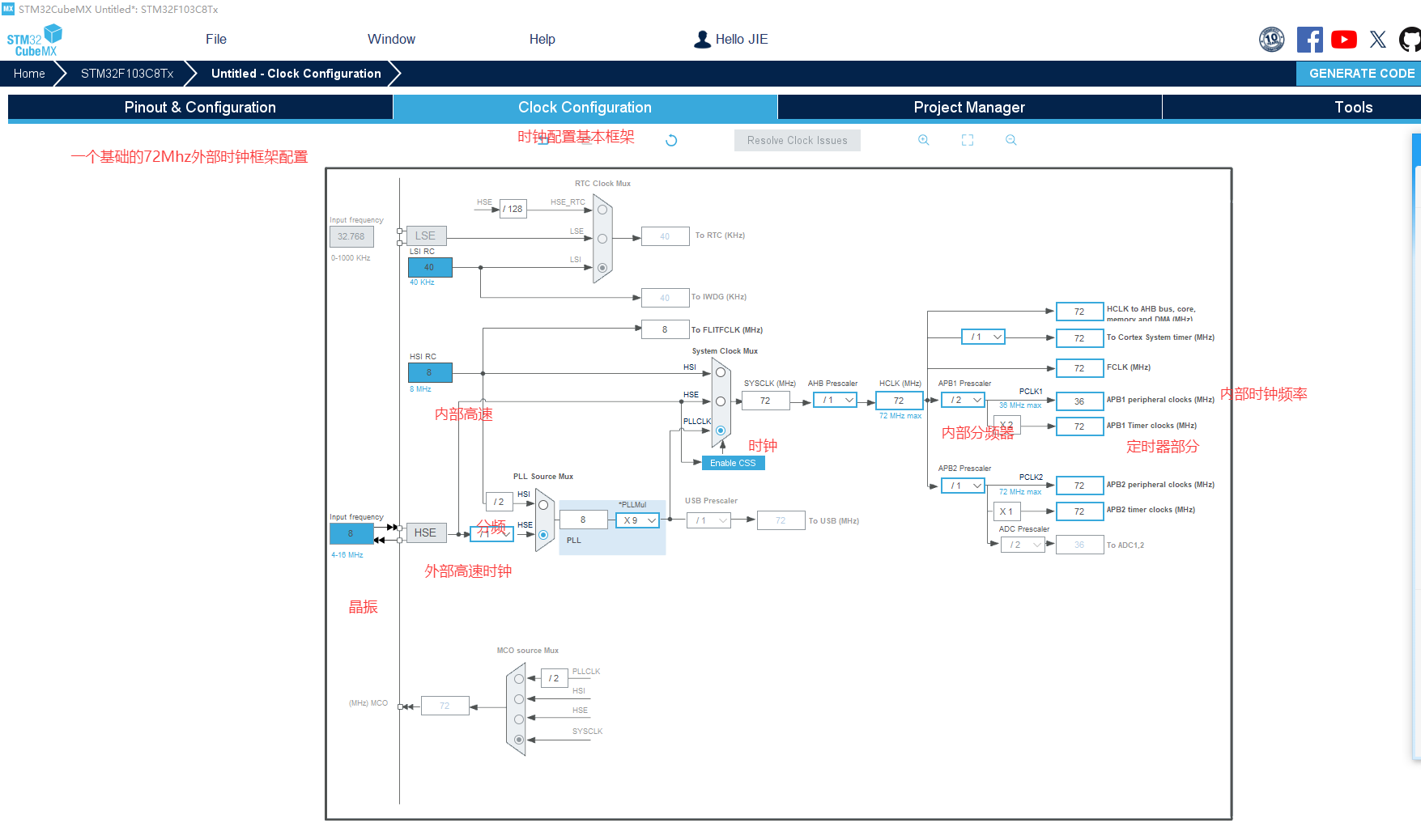 配置对应外部时钟,和基本流程。板子是stm32f103系列