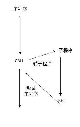 在程序设计时,将经常使用的“算法”编制为子程序,供其他程序调用。通常,把调用子程序的程序称为主程序。当主程序执行调用指令(CALL)后,CPU 就转入执行子程序;而当子程序执行返回指令(RET)后,CPU 又重新继续执行原来的主程序,如图(CALL 和 RET 指令)所示。