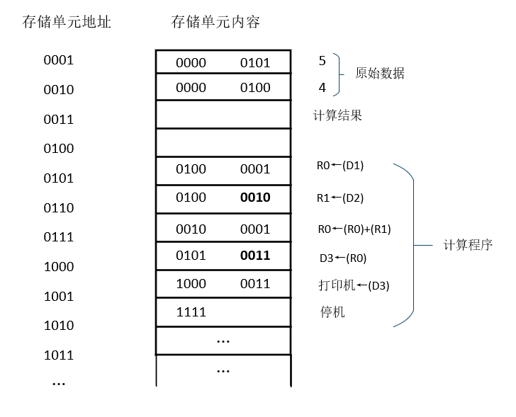表(用二进制码表示的计算程序)给出了计算 5+4 的真正计算程序,其含义与表(计算 5+4 的程序(文字形式)的改写形式)给出的最原始的计算程序完全一样,到其能够为计算机所存储、识别和执行。根据所述对数据和指令在存储器中存放地址的假定,可以得到图(存储器布局)所示的存储器布局。
