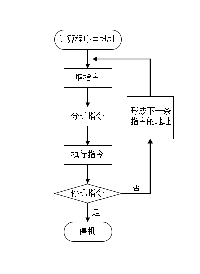 ③指令的逐条执行是由计算机硬件实现的,可顺序完成取指令、分析指令、执行指令所规定的操作,并为取下一条指令准备好指令地址,如图(计算机基本工作原理)所示。如此重复,直至执行到停机指令。