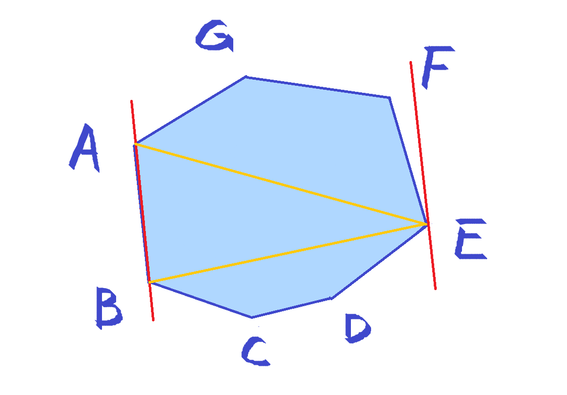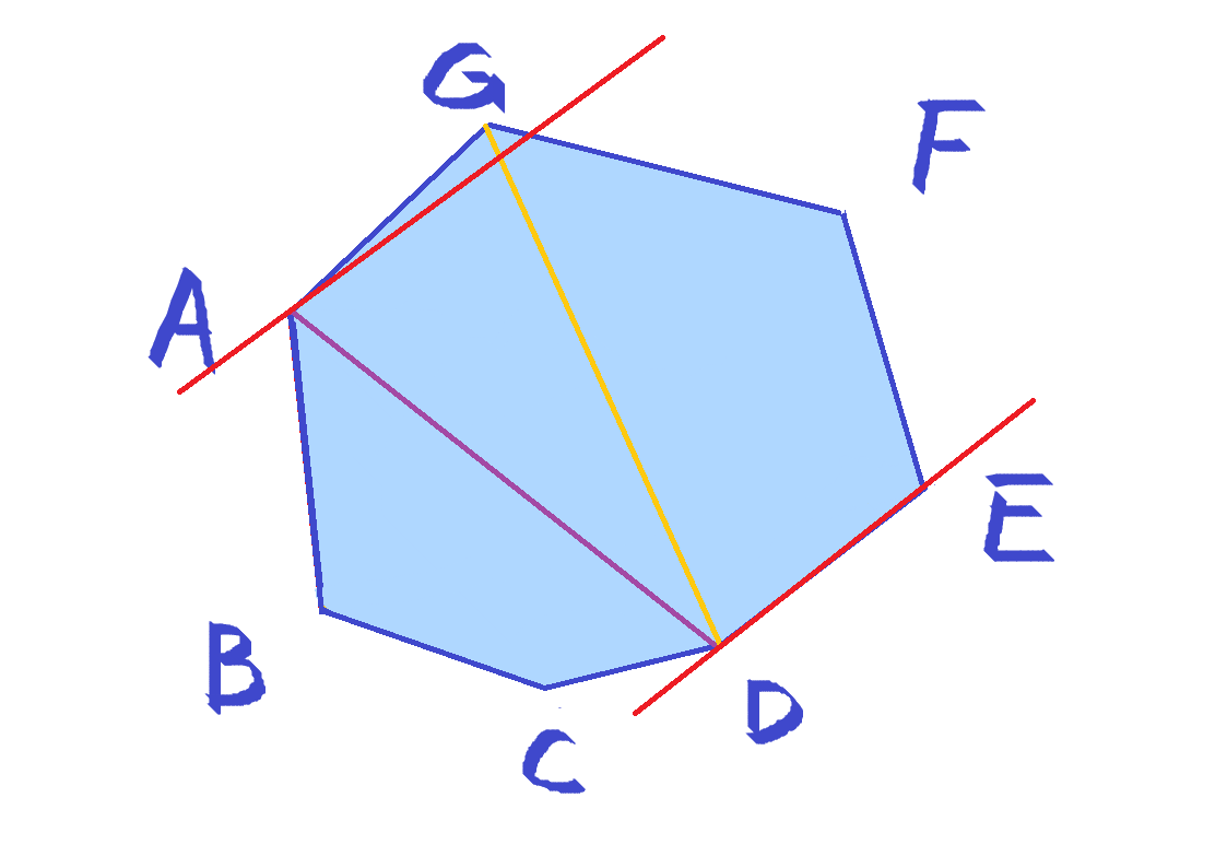 想象用两块平行木板夹住凸多边形旋转。固定左木板在顶点 A,右木板会接触对面的某个位置。