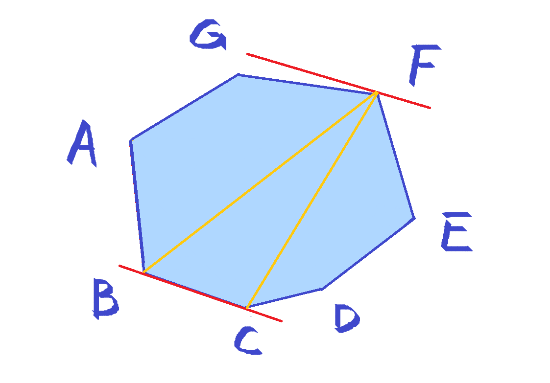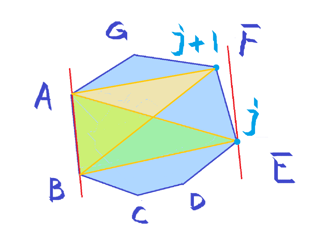 - 枚举凸包上的对角线,对于每条对角线,找到两侧使得四边形面积最大的两个点