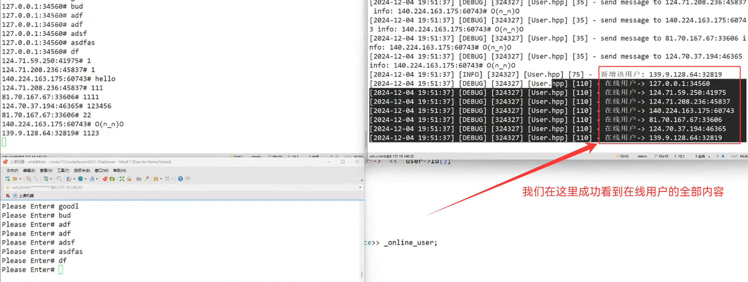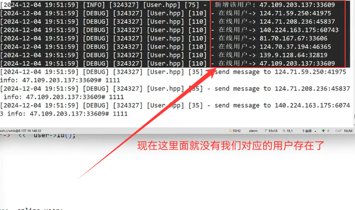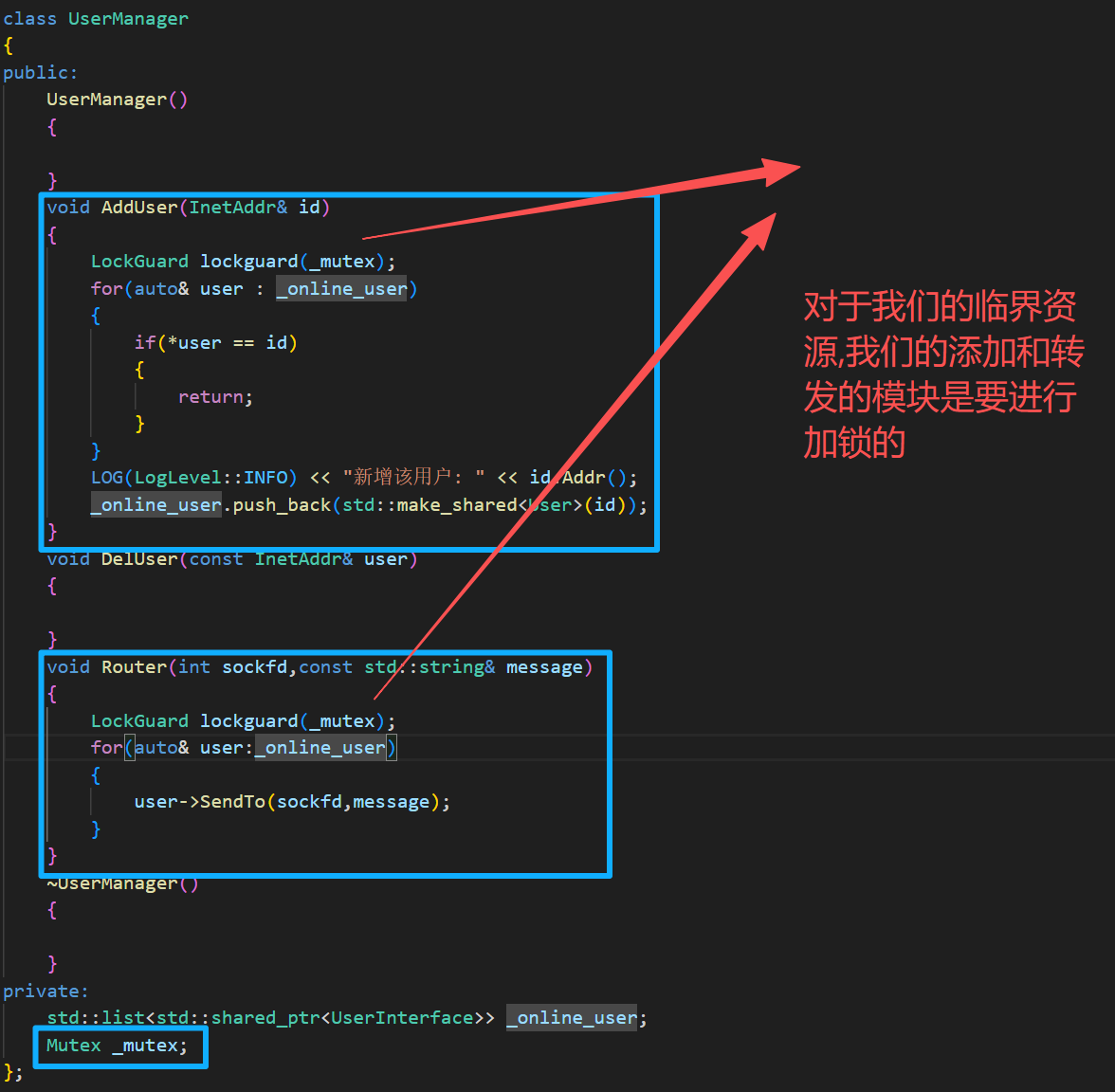 public:UserManager(){}void AddUser(InetAddr& id){LockGuard lockguard(_mutex);for(auto& user : _online_user){if(*user == id){return;}}LOG(LogLevel::INFO) << "新增该用户: " << id.Addr();_online_user.push_back(std::make_shared<User>(id));}void DelUser(const InetAddr& user){}void Router(int sockfd,const std::string& message){LockGuard lockguard(_mutex);for(auto& user:_online_user){user->SendTo(sockfd,message);}}~UserManager(){}